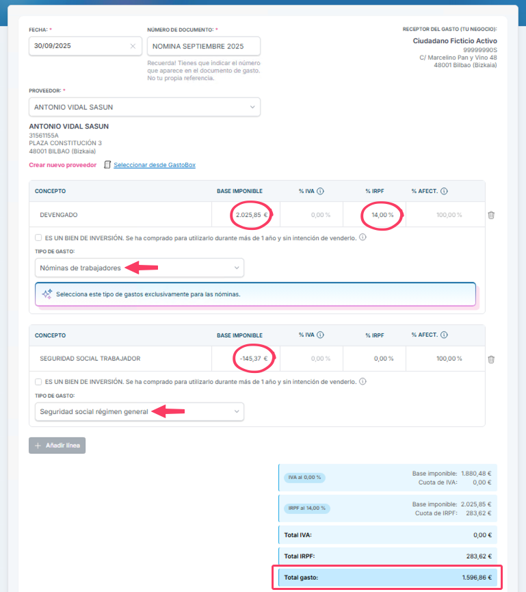 - En el total del gasto deberá aparecerte el importe líquido de la nómina.