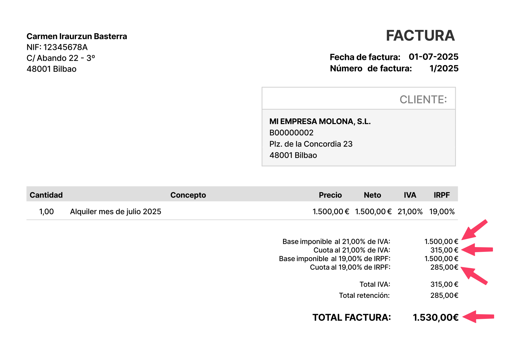 Vamos a verlo a través de un ejemplo: suponemos una factura de alquiler con el siguiente desglose: