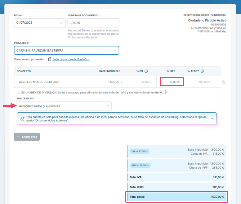 - Tipo de gasto: Selecciona el tipo de gasto que corresponde dependiendo del concepto de factura. Para el alquiler de oficina tienes que seleccionar "Arrendamientos y alquileres".