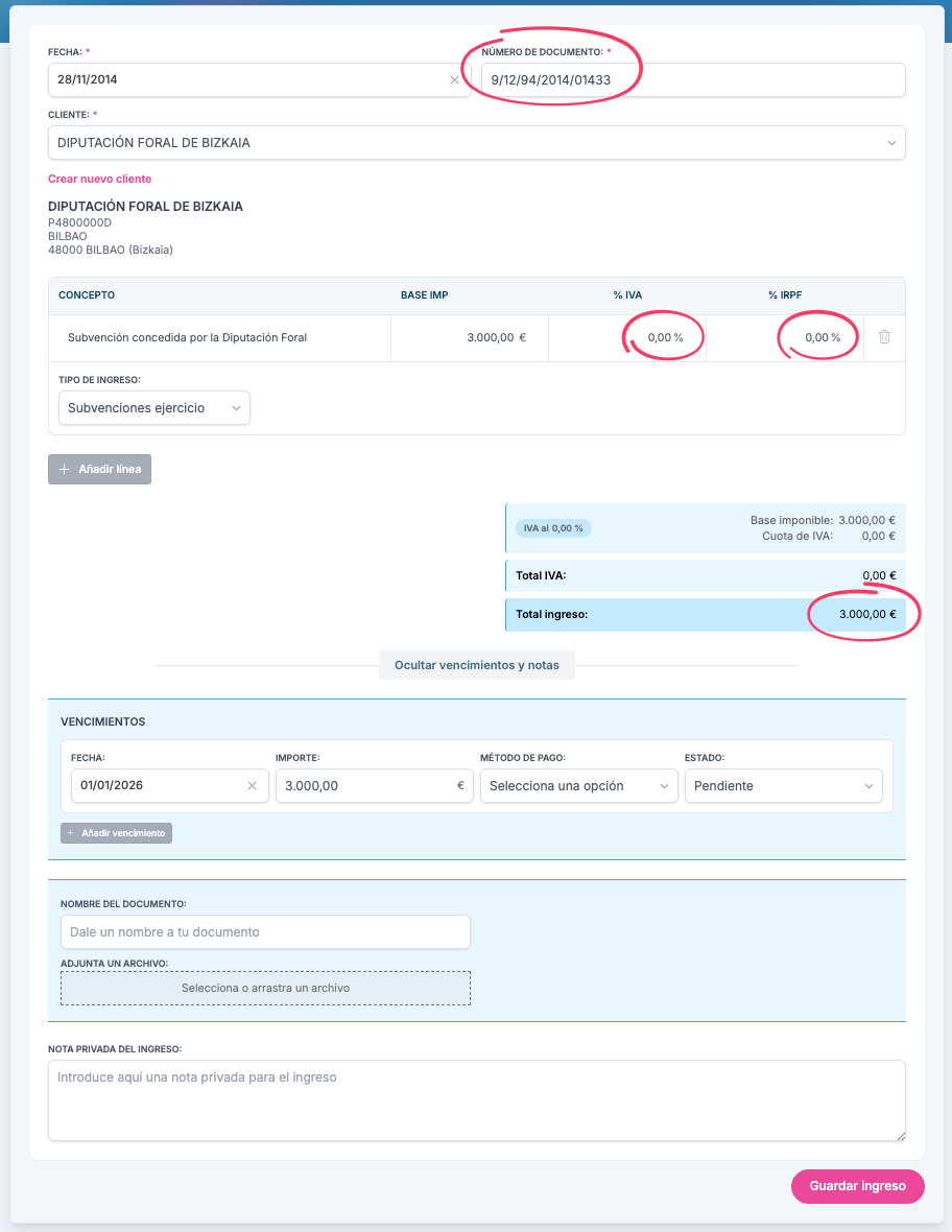 - Concepto: Cumplimenta la descripción del ingreso recibido. Puedes indicar, por ejemplo, “Subvención de la Diputación Foral de Bizkaia”.