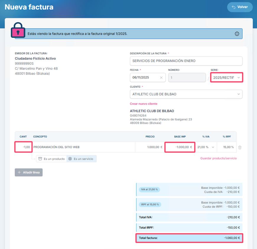 - Automáticamente, la aplicación te dirigirá al formulario de creación de nueva factura, trasladando los datos de la factura original pero con las cantidades en negativo. La serie de facturación habrá sido seleccionada automáticamente para ser diferente de la original y cumplir con la normativa de facturación. No debes modificar los datos que aparecen por defecto.