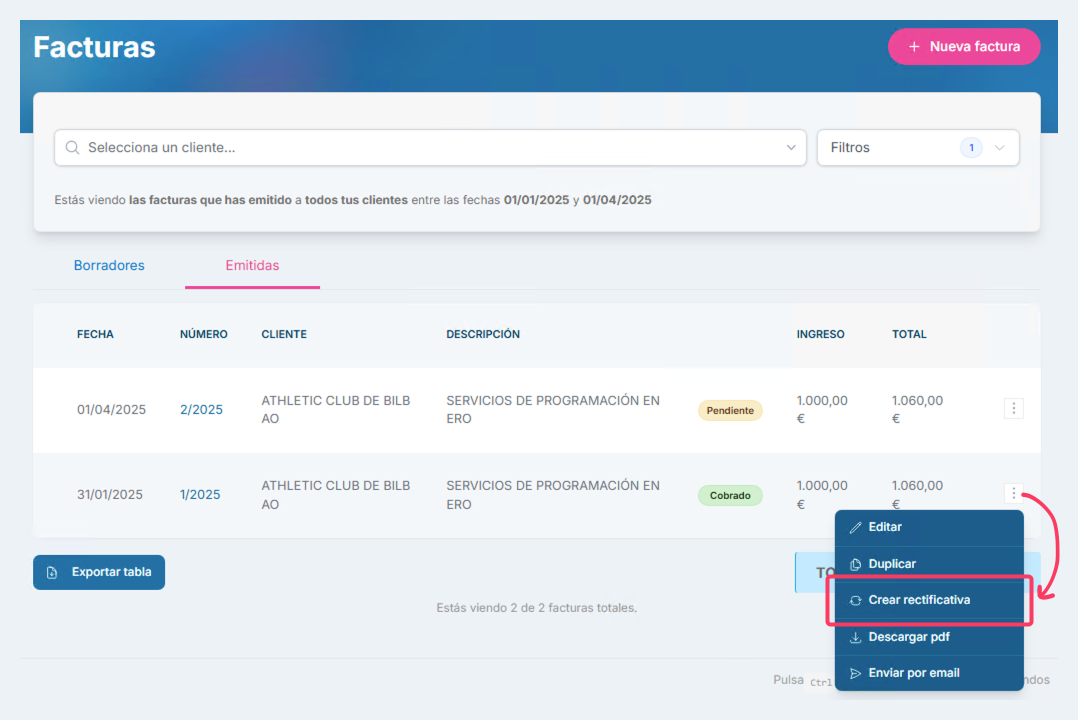 - Haz clic en el botón de opciones de la factura, y pulsa en la opción de "Crear rectificativa", tal y como puedes ver en la imagen: