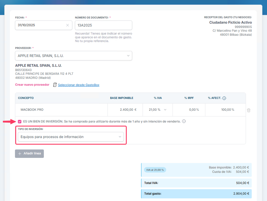- Marcaremos con un clic la casilla: “ES UNA INVERSIÓN. Se ha comprado para utilizarlo durante más de 1 año y sin intención de venderlo”.