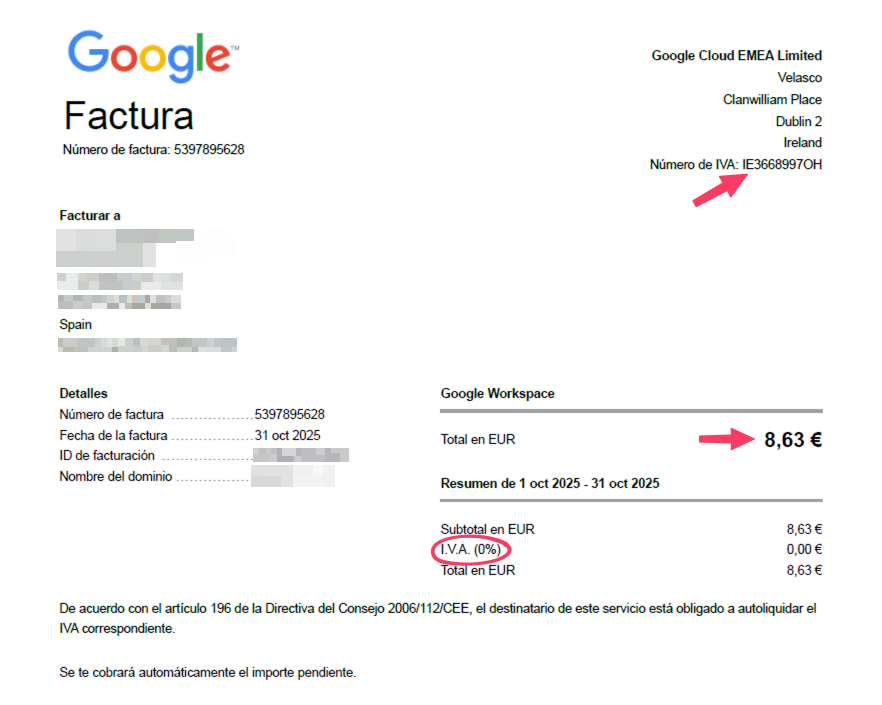 Si estás dado de alta en el ROI, la factura no debe llevar IVA. Por ejemplo, suponemos una factura de Google Workspace con el siguiente desglose: