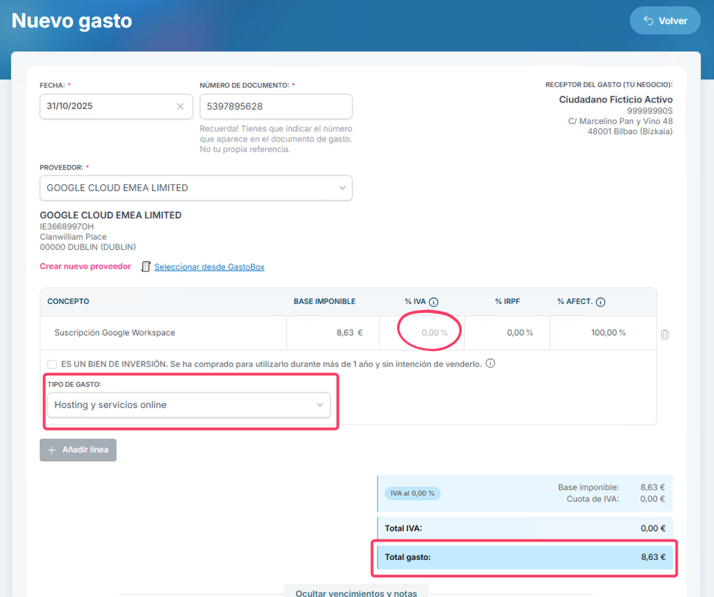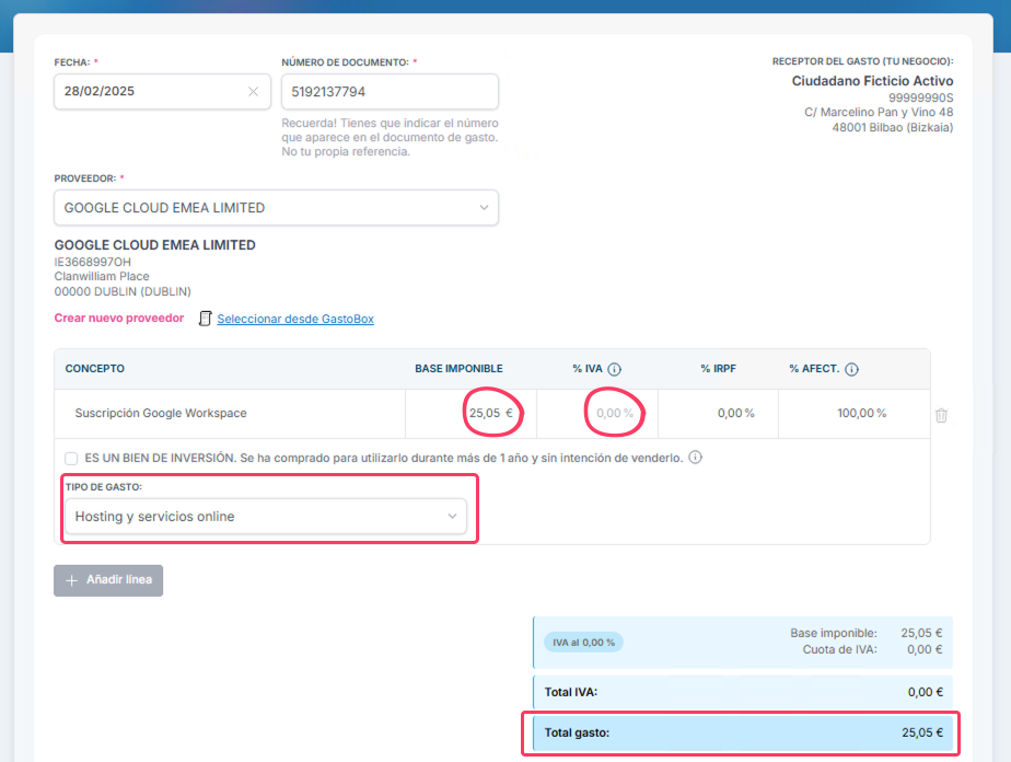 - % IVA: Tienes que indicar 0,00%, ya que la factura, aunque incluya IVA, no es deducible.
